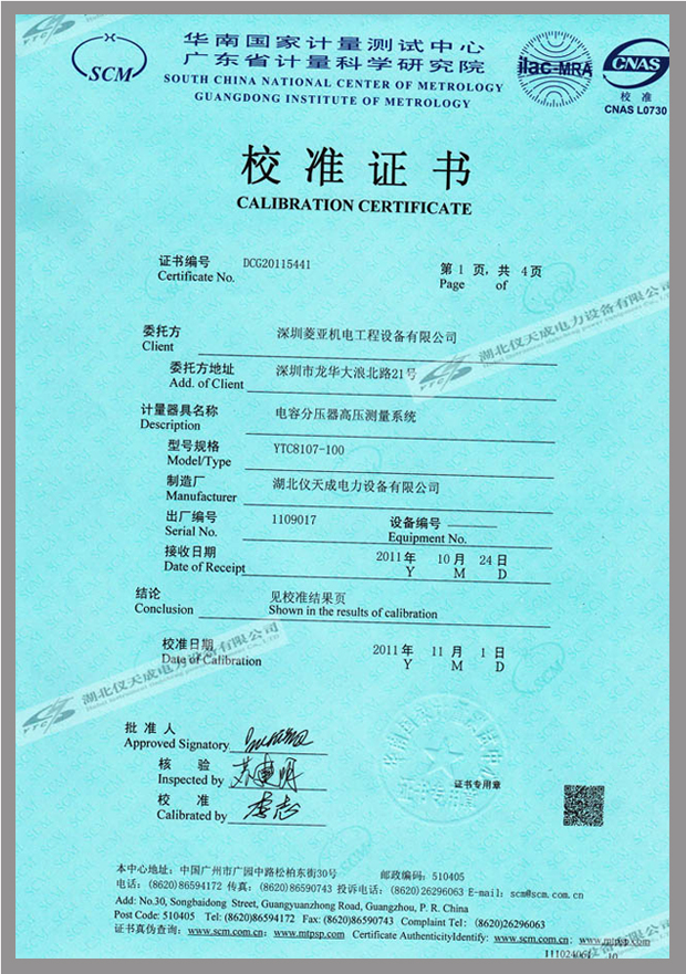 轉(zhuǎn)載:"YTC8107系列電容分壓器高壓測量系統(tǒng)鑒定證書" 請注明來源于儀天成電力。 更多技術(shù)問題請致電儀天成電力客戶服務(wù):027-87876585,技術(shù)部專線:027-87876585,在線客服: